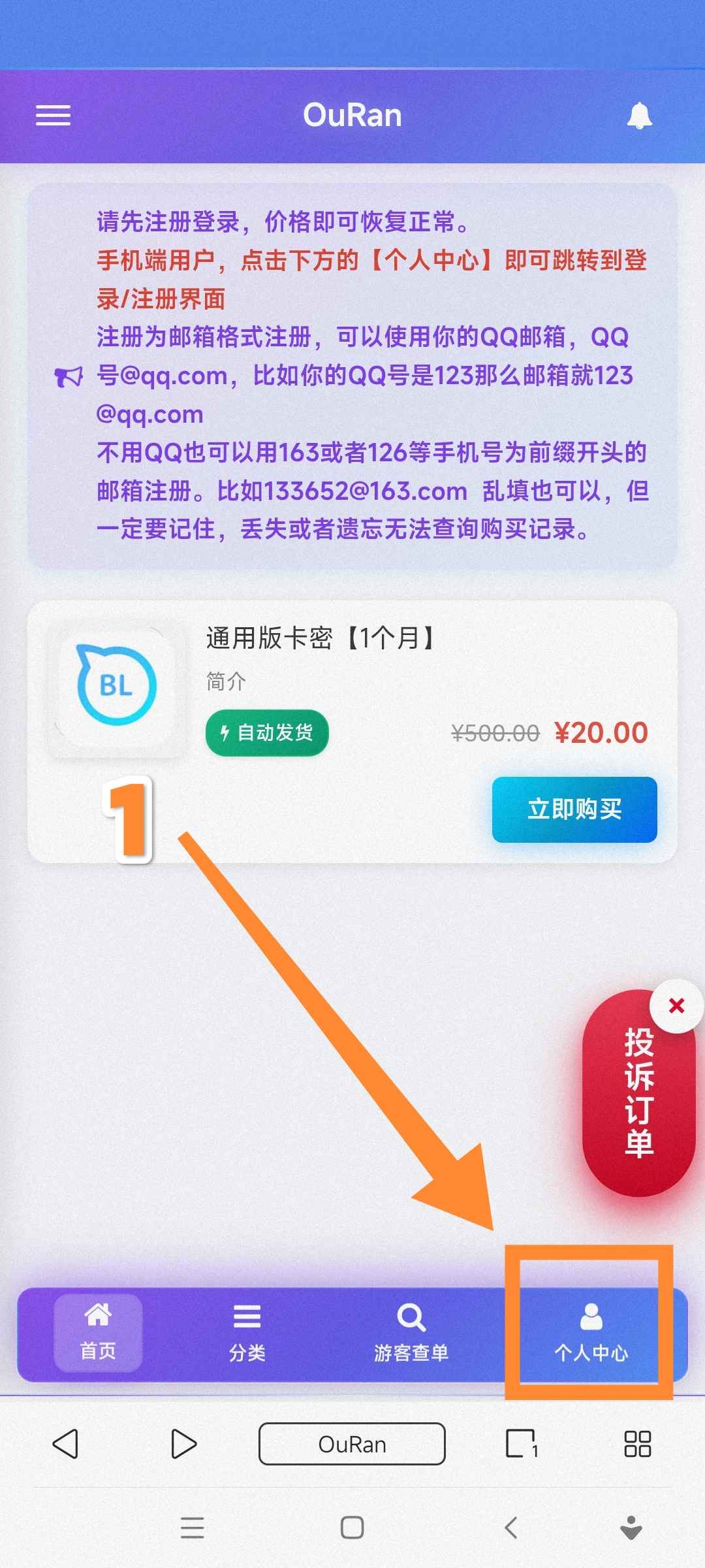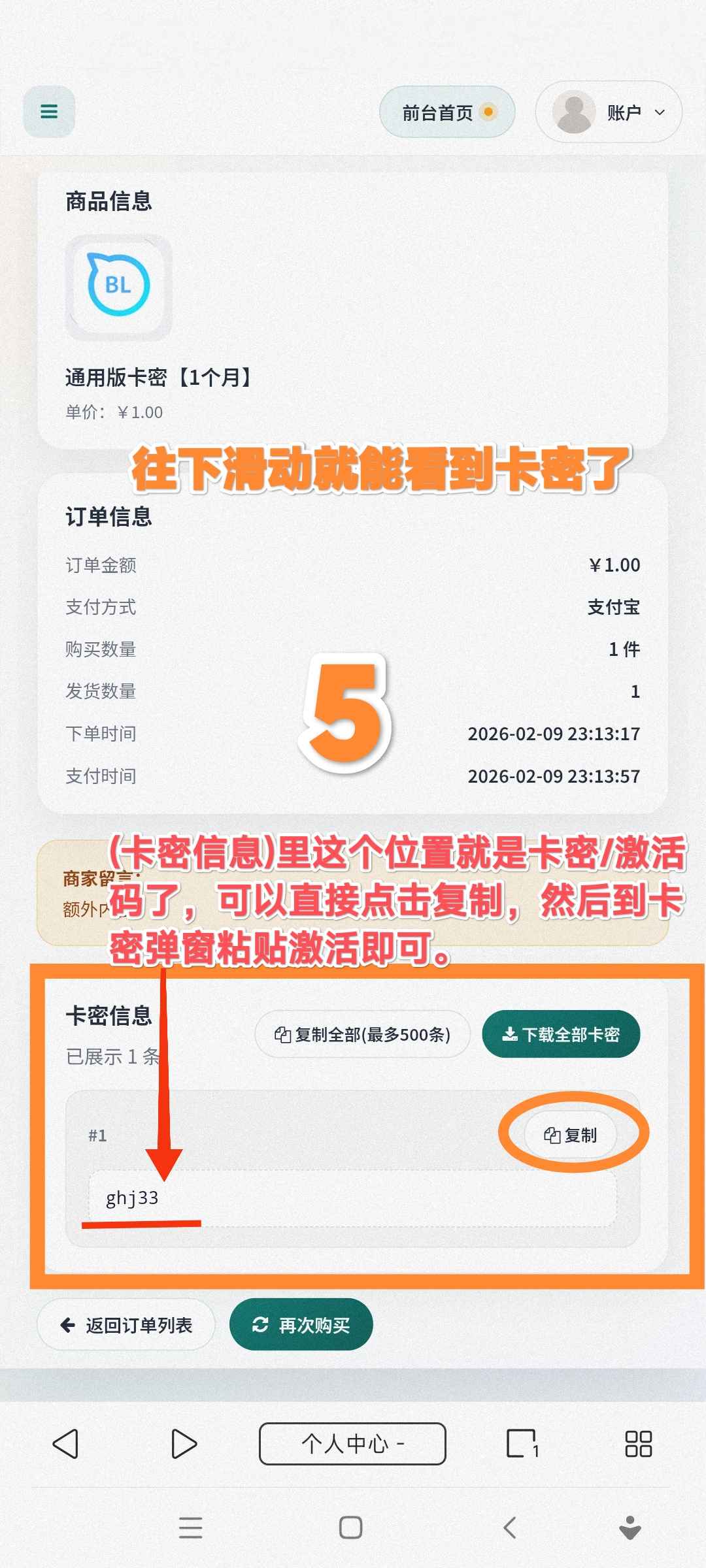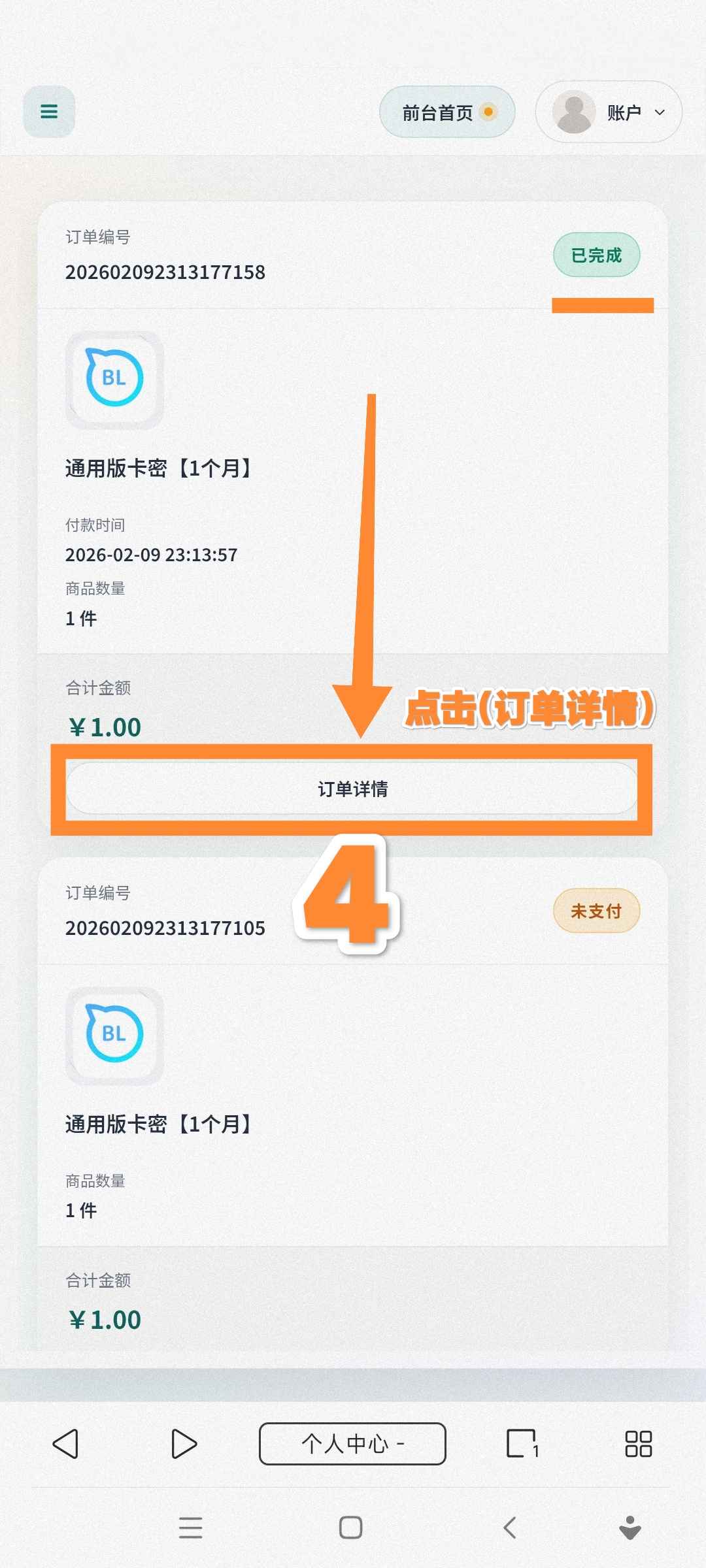 « 教你查订单卡密 发布于 2026-2-15 21:38 阅读:1998 如图所示↓登录后点击【个人中心】开始进行查单 如果已支付却在订单查询时显示(未支付),请发送付款记录截图到客服邮箱中核对后给你补发卡密。 ,本次教学到此结束。